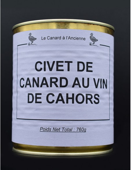 Ing : viande de canard avec os, vin de Cahors (43%) (Sulfites), couennes de porc, farine (gluten), oignons, carottes, sel, poivre, thym et laurier